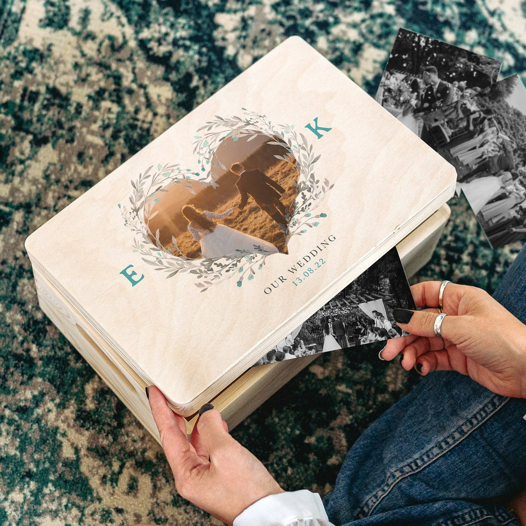 A personalised wedding photo keepsake memory box to keep sentimental momentos from a couples big day.