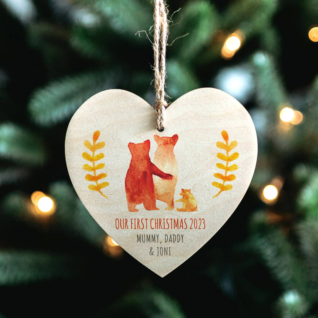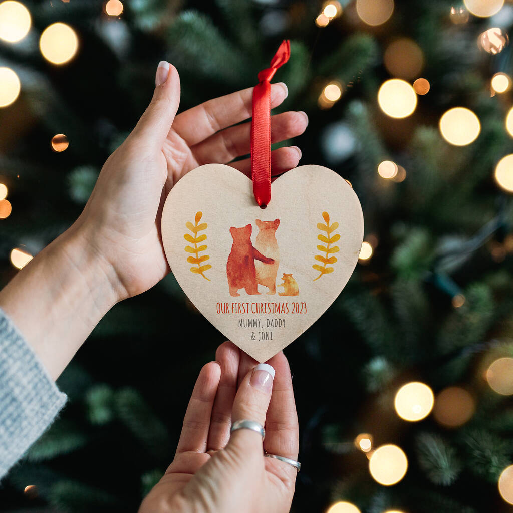 Commemorate a first Christmas as a family or a couple with this lovely personalised bear family bauble or heart decoration.