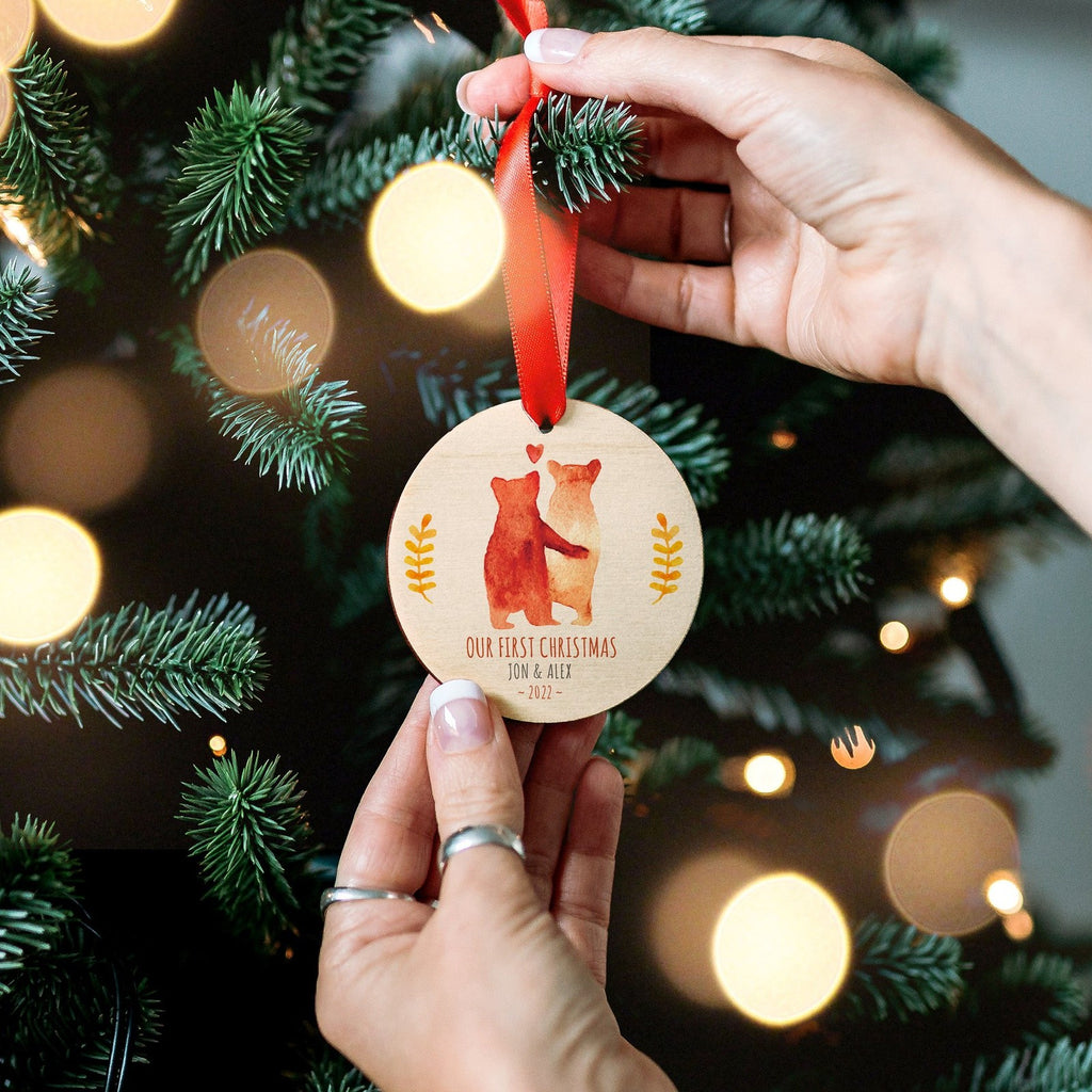 Your wedding or your little bears arrival would have been the most important day of the year, making this Christmas a 'beary' special one indeed! Celebrate your first Christmas as a married couple or family for years to come with this delightful wooden decoration, displaying a bear couple or little bear family and your own names, along with the year.