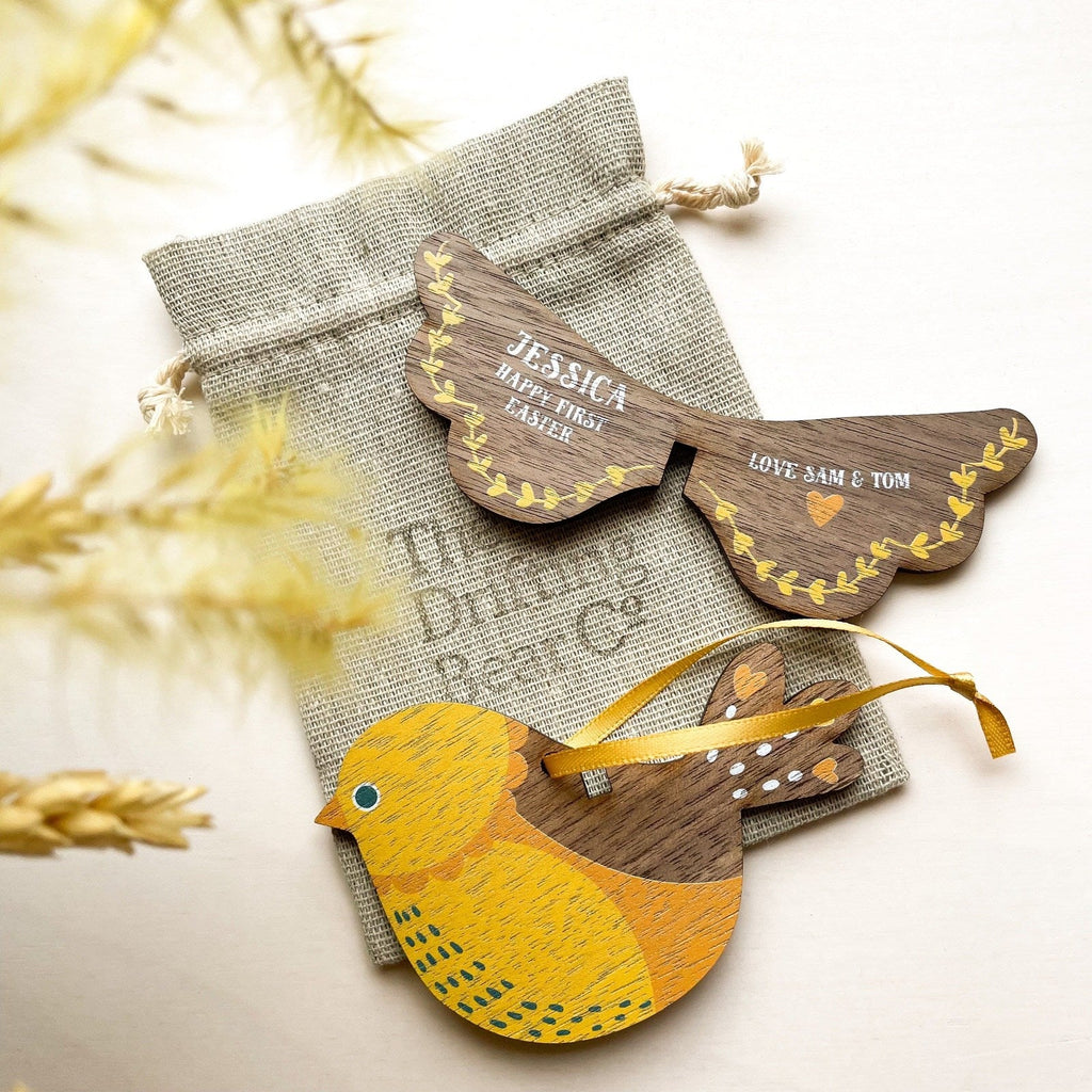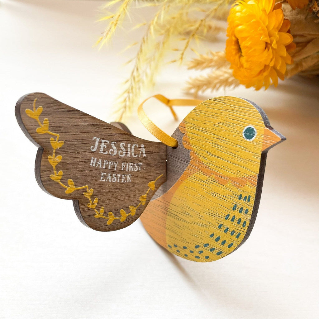 Commemorate the arrival of your new baby chick with this colourful wooden decoration, complete with pretty yellow ribbon - perfect for hanging in the baby's nursery.