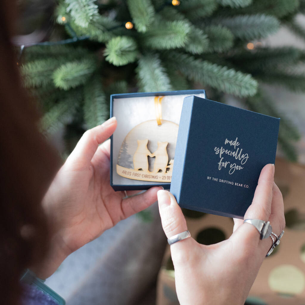 This personalised baby's first Christmas decoration makes a perfect gift for a couple celebrating their first Christmas with their new baby and makes a beautiful keepsake to put on the tree year after year to rekindle happy memories of a very special Christmas.
