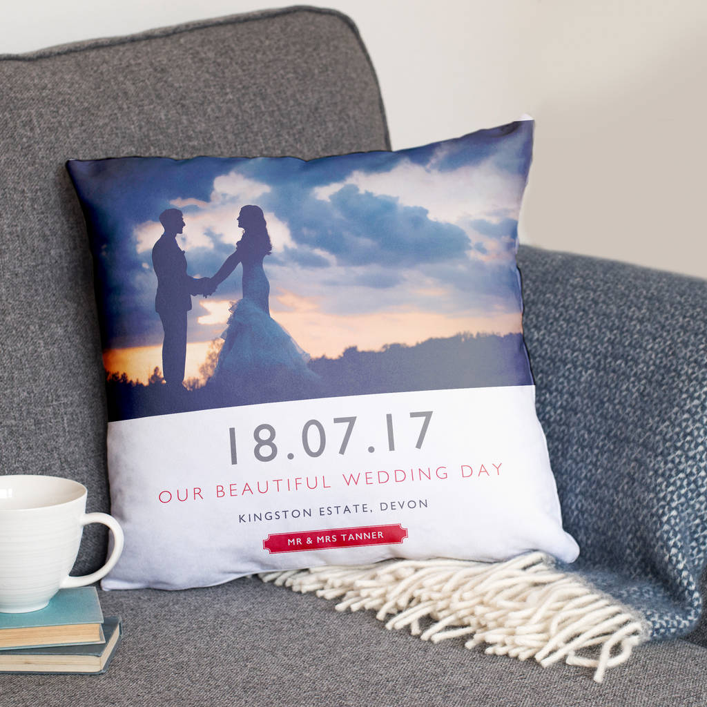 Celebrate a special wedding day with this 'Personalised Wedding Date And Location Photo Cushion'.