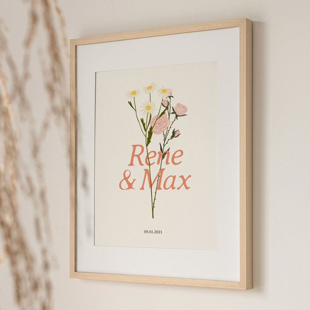 A beautiful hand drawn birth flower print, illustrated with two intertwined blooms representing a couple's birth flowers, along with their names and a special date.