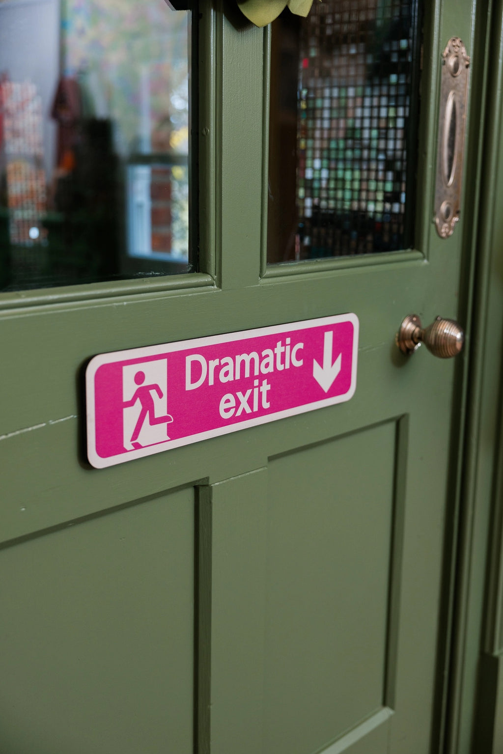 This humorous 'Dramatic Exit' sign transforms the familiar UK fire exit into a celebration of theatrical drama, complete with a rainbow backdrop or choice of other background colours. Perfect for performers, creatives, drama queens and anyone wants to introduce some humour and drama into their home.