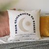 A unique cushion featuring a lovely moon and star design, with your own special locations and names, and the quote 'We're always under the same moon.'