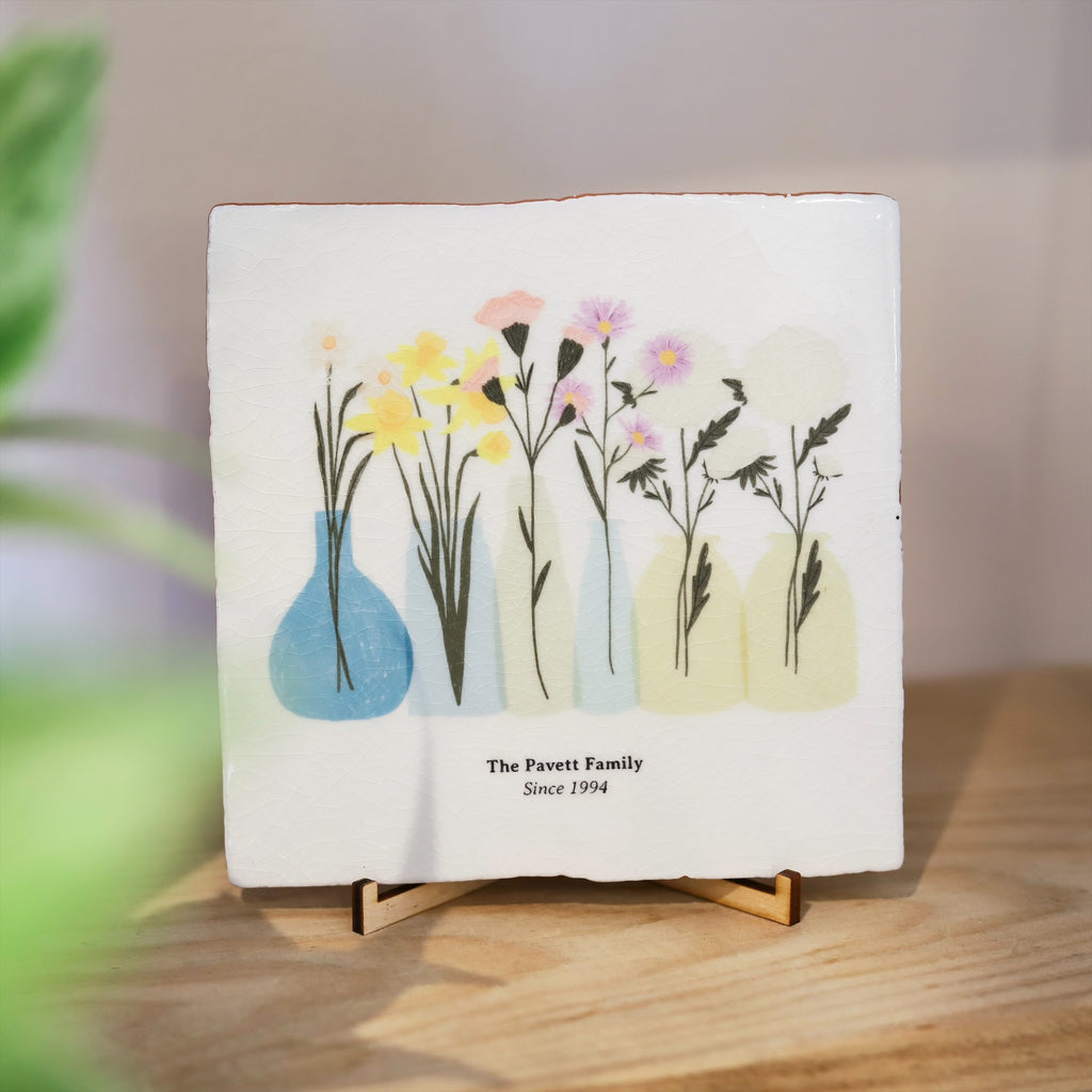 A beautiful Personalised Family Birth Flowers Ceramic Tile, showing vases holding the blooms of each family members birth flower.