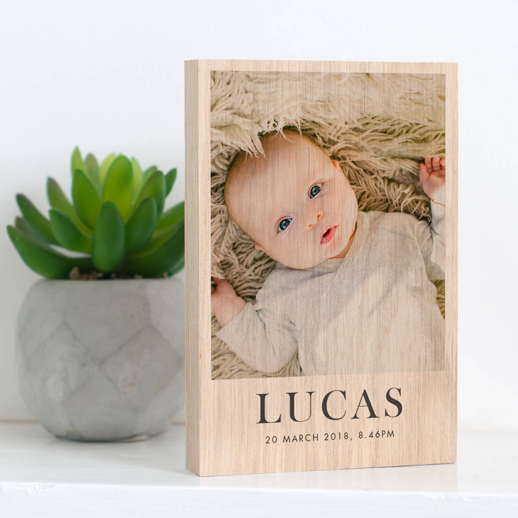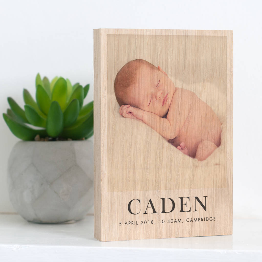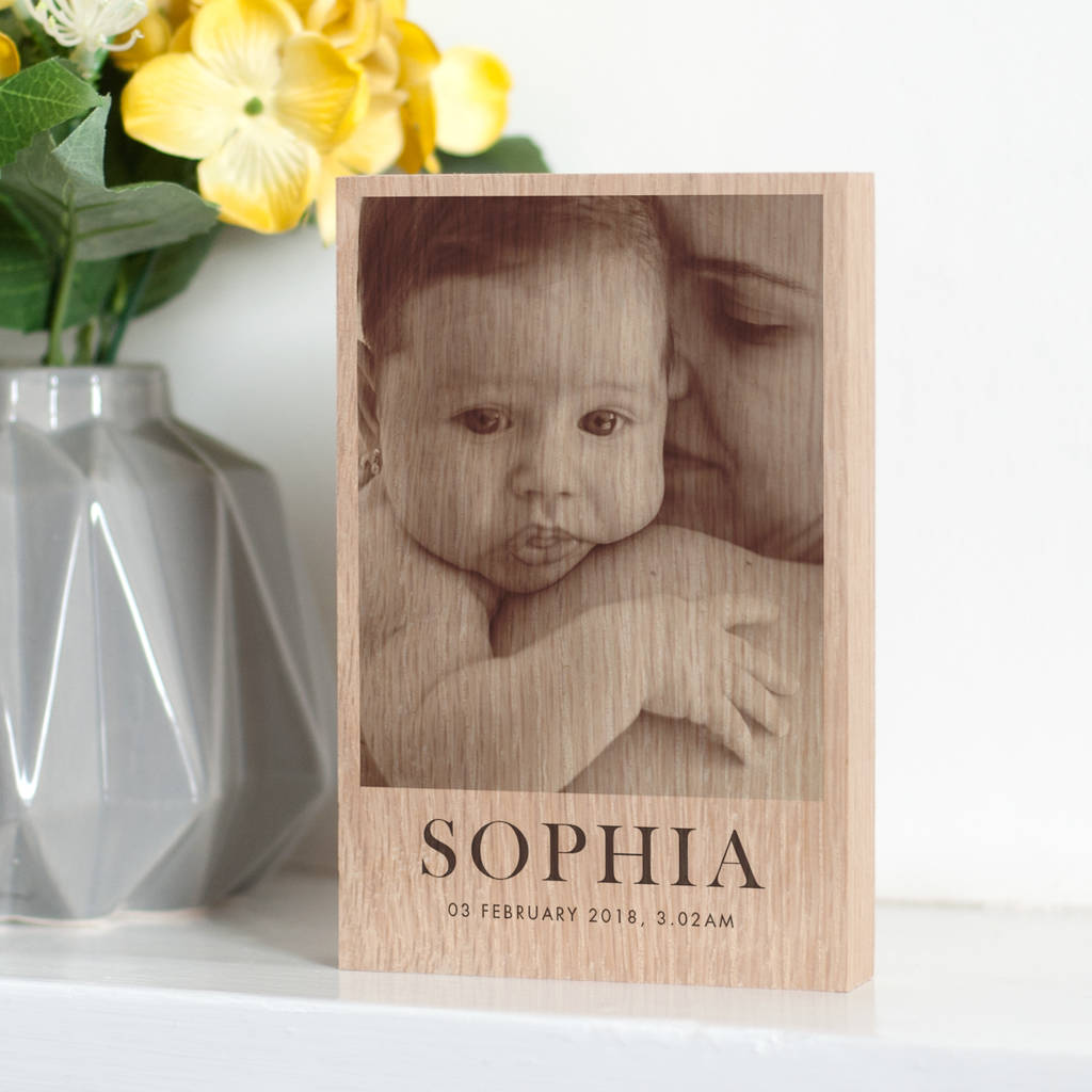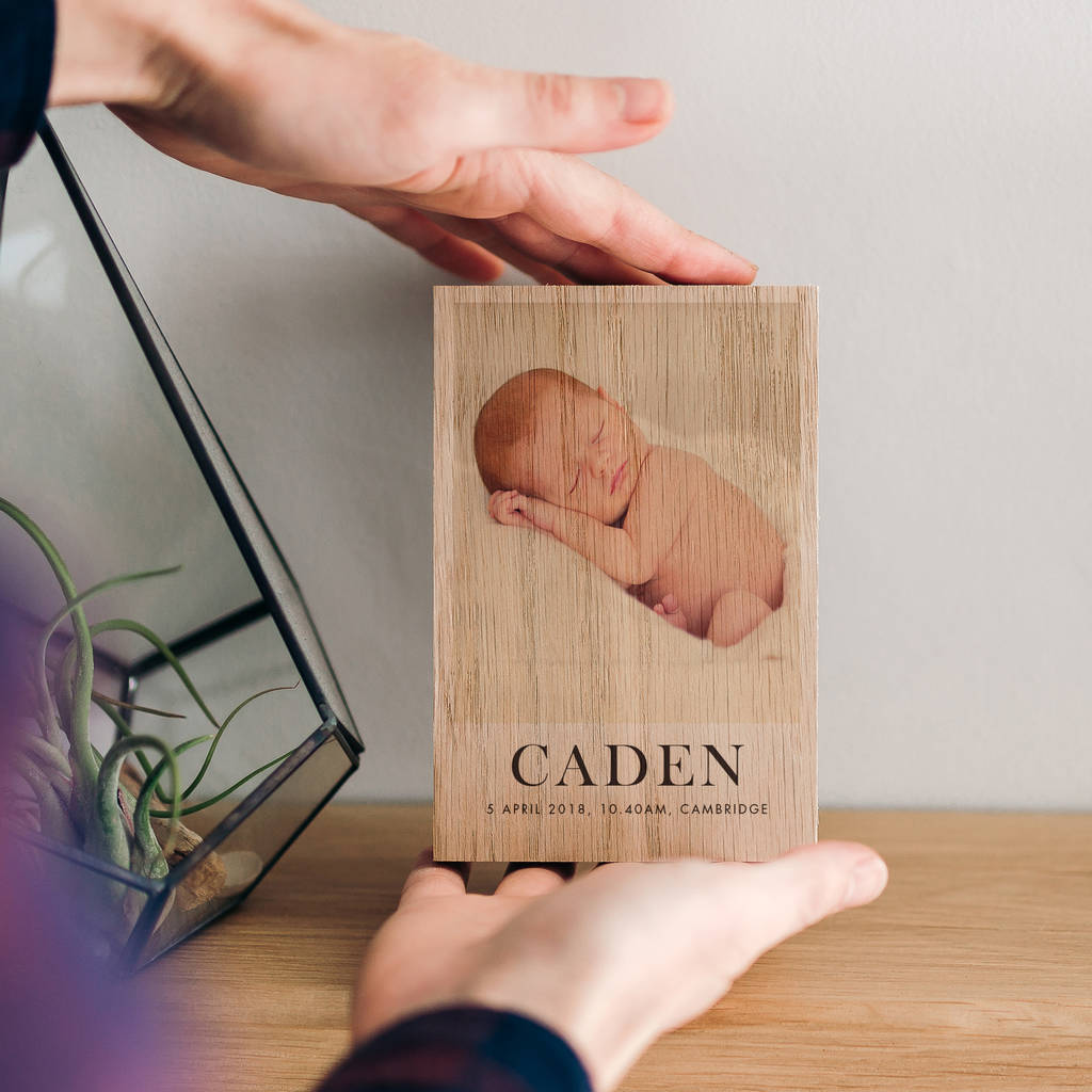 Commemorate the arrival of a new baby with our Personalised New Baby Solid Oak Wooden Photo Block.