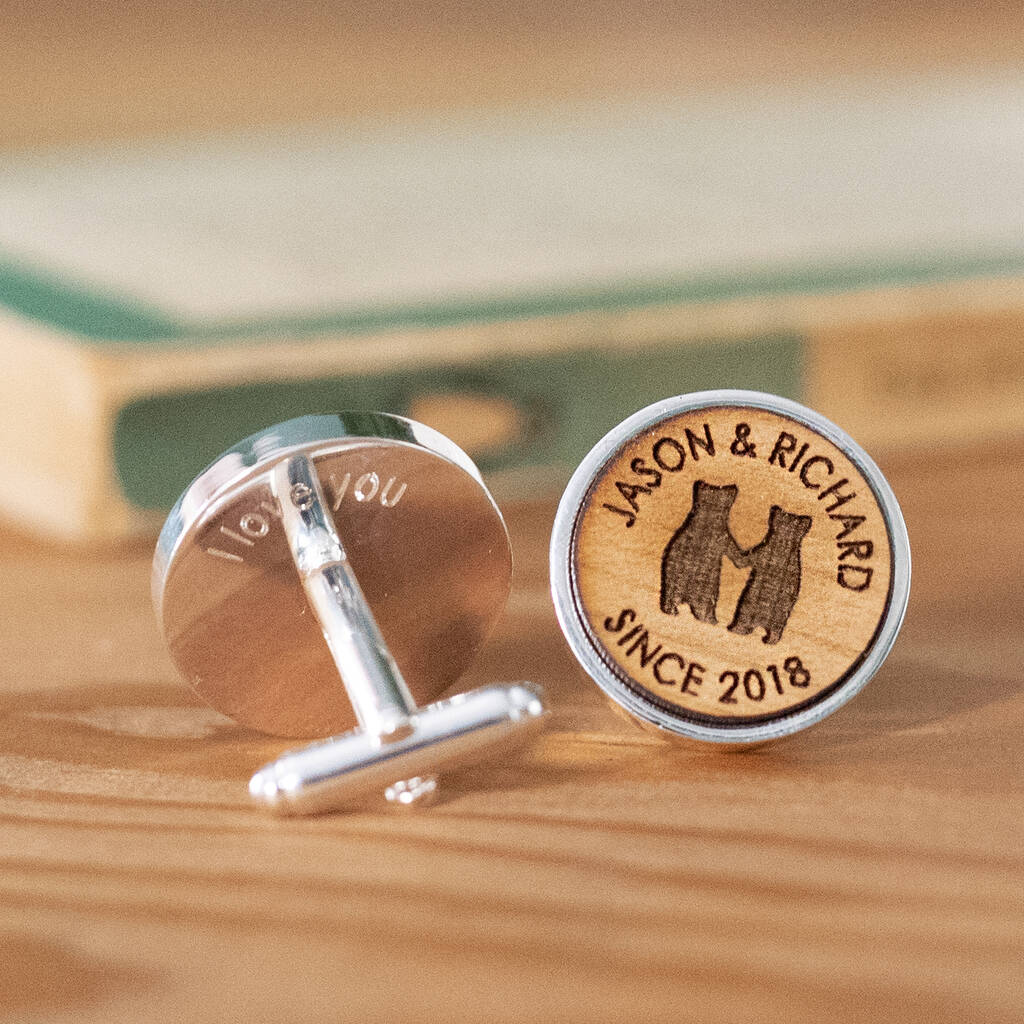 Engraved with two adult bears hand in hand along with names and the year the couple met, got engaged or married, these personalised cufflinks make a smart yet sentimental gift.