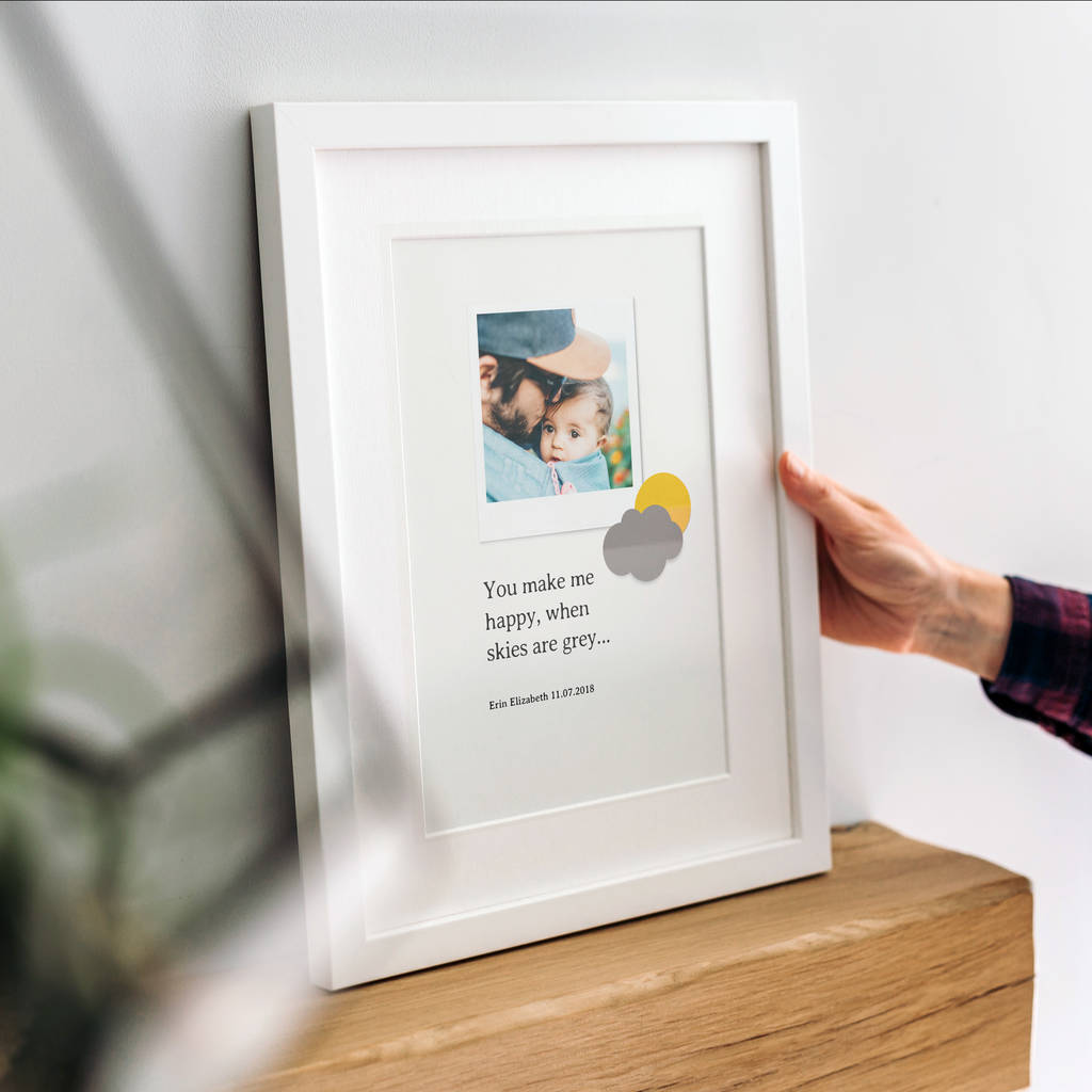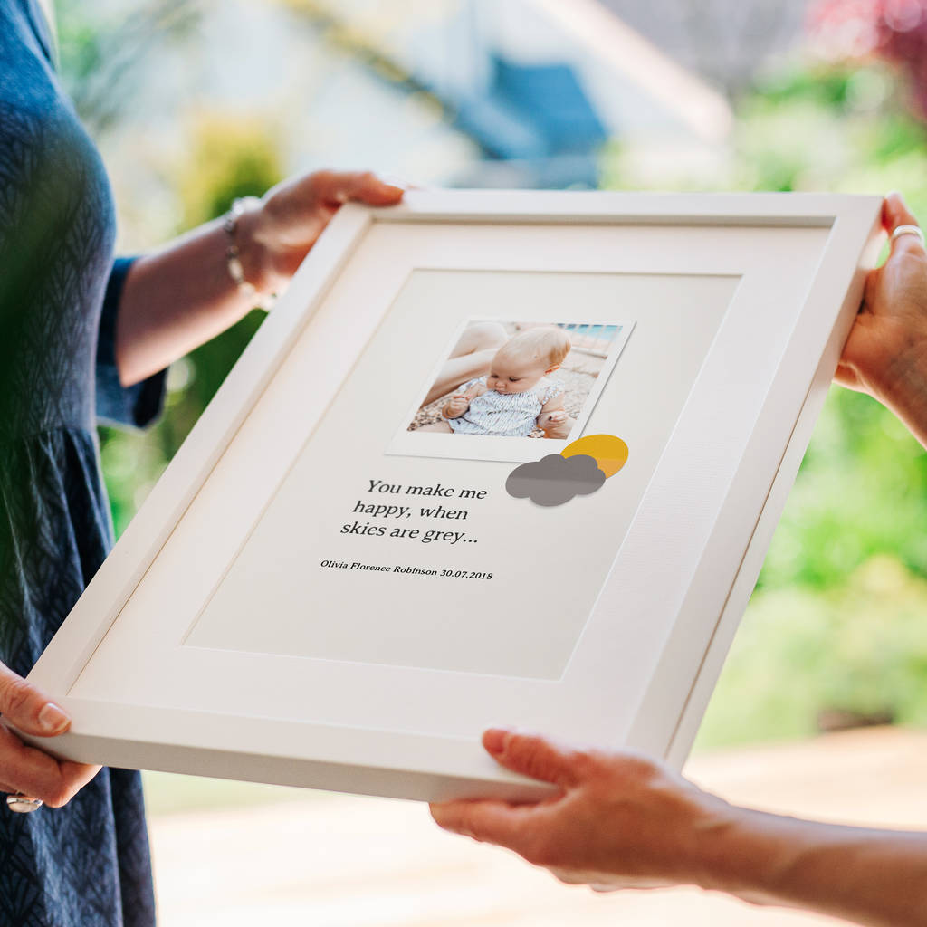 A personalised photo print for baby, designed with your own photo and the words 'You make me happy, when skies are grey'.