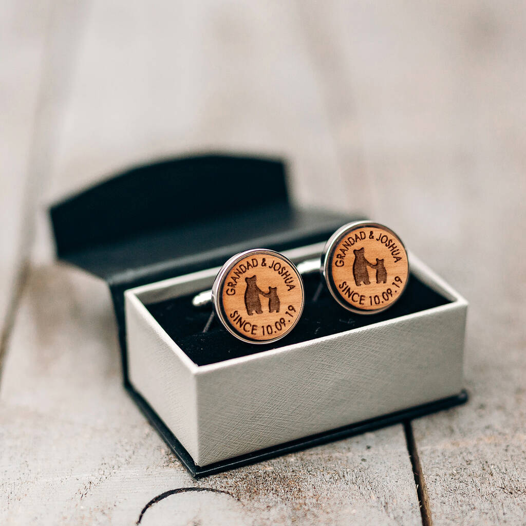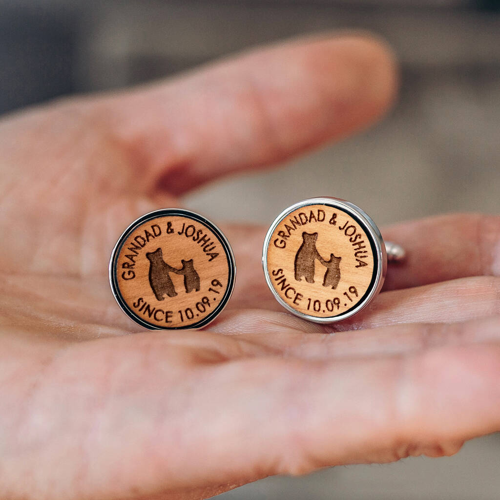 Engraved with an adult and child bear holding hands along with names and the year the child was born, these personalised wooden cufflinks for grandad make a smart yet sentimental gift.