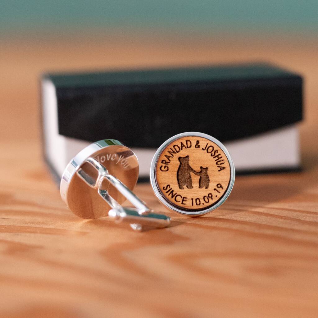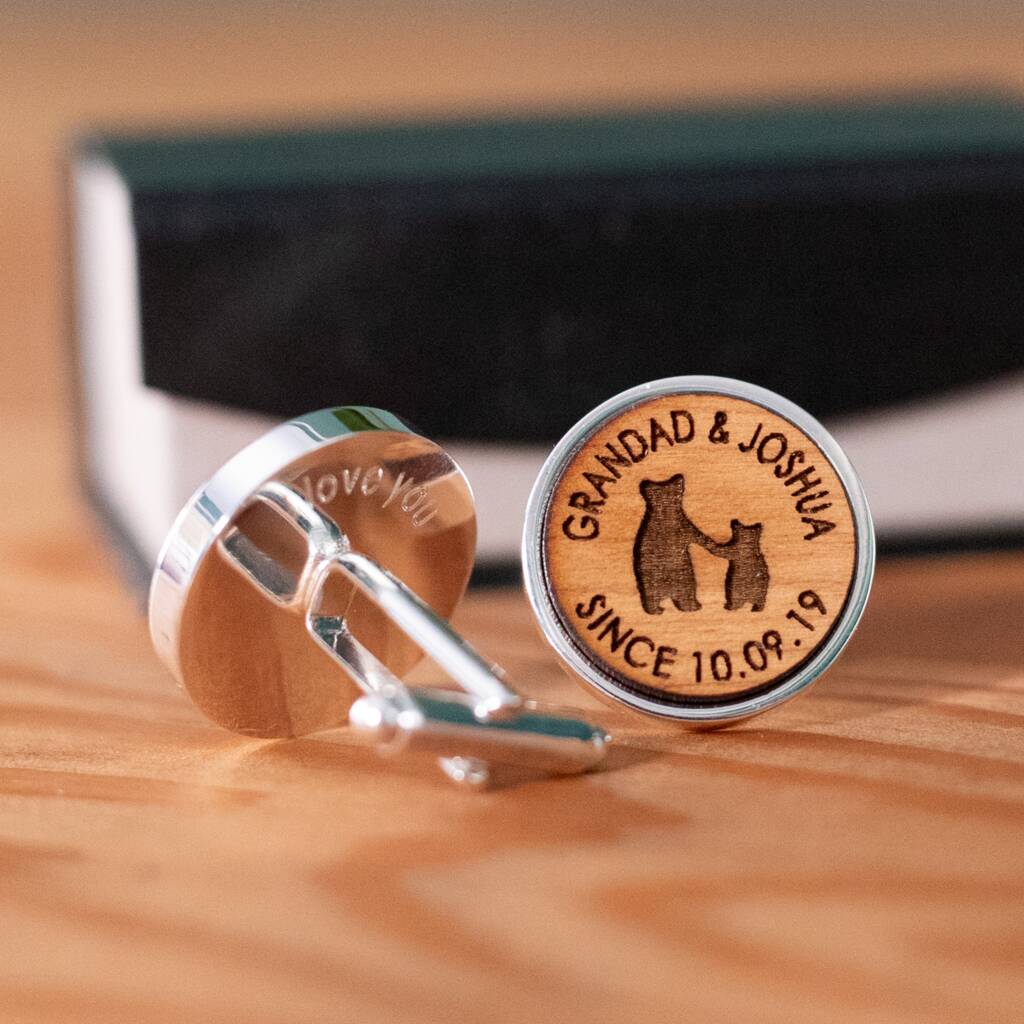 Silver plated with beautiful engraved cherry wood, these personalised wooden cufflinks make a perfect gift for Grandad off their favourite little bear cub or cubs.