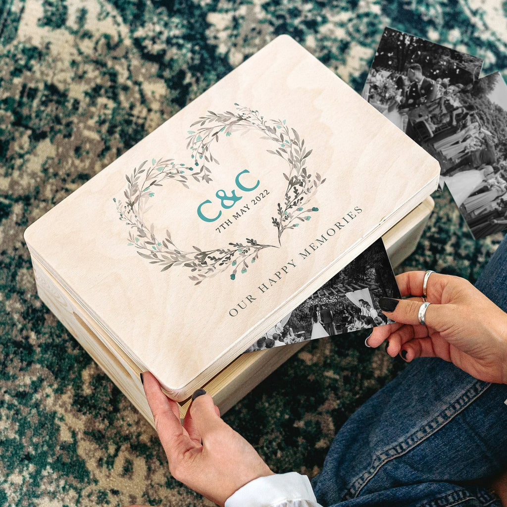 Ensure the memories of a couple's special day are kept forever with this personalised wedding memories keepsake box, complete with the couples initials and wedding date within a beautiful wreath style heart.