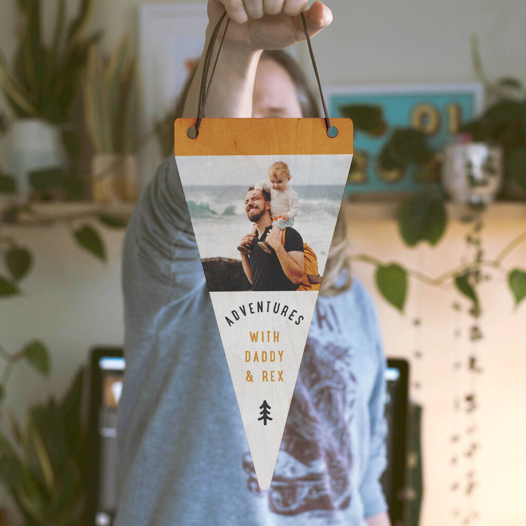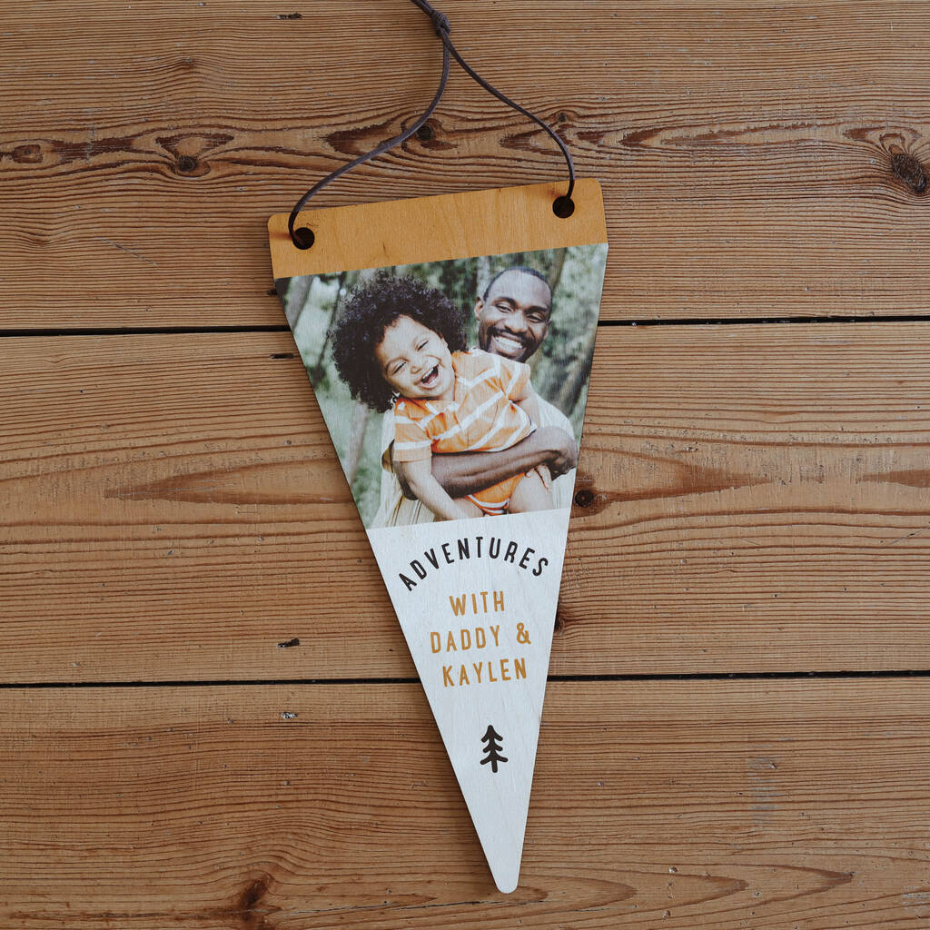Treasure your favourite adventures with this wooden pennant flag, displaying your own photo and personalised text.