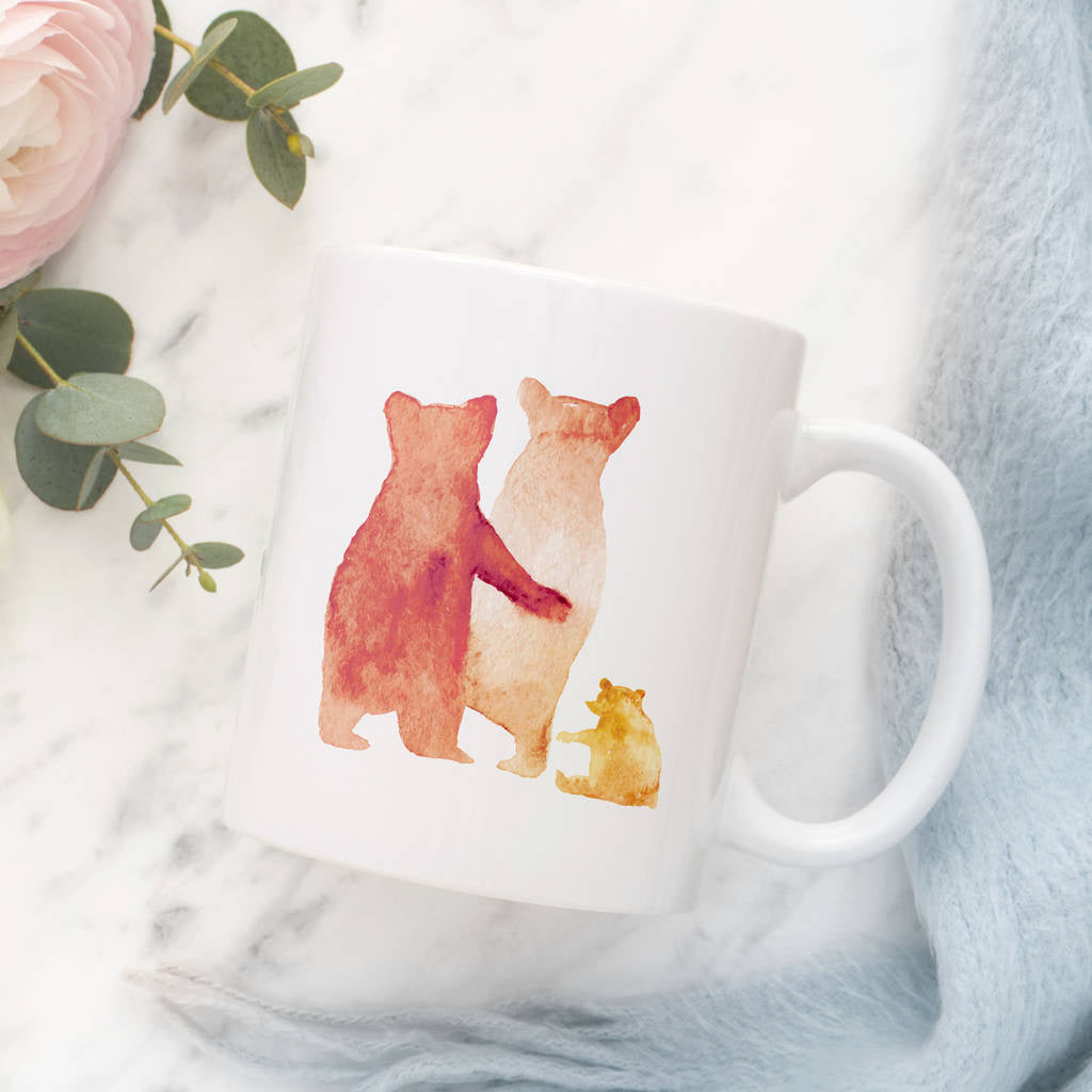 These lovely watercolour style illustrated bears symbolise a loving family unit. Recreate your own family by choosing how many parents, babies, little, or young adult bears to display on your mug by using the menu options.