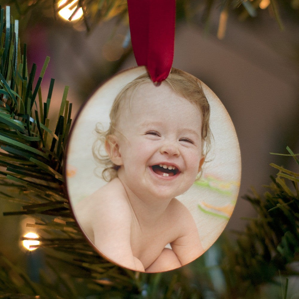 Your favourite photos are printed individually onto wooden discs to create these personal alternatives to Christmas baubles, allowing you to create you very own take on a family tree.