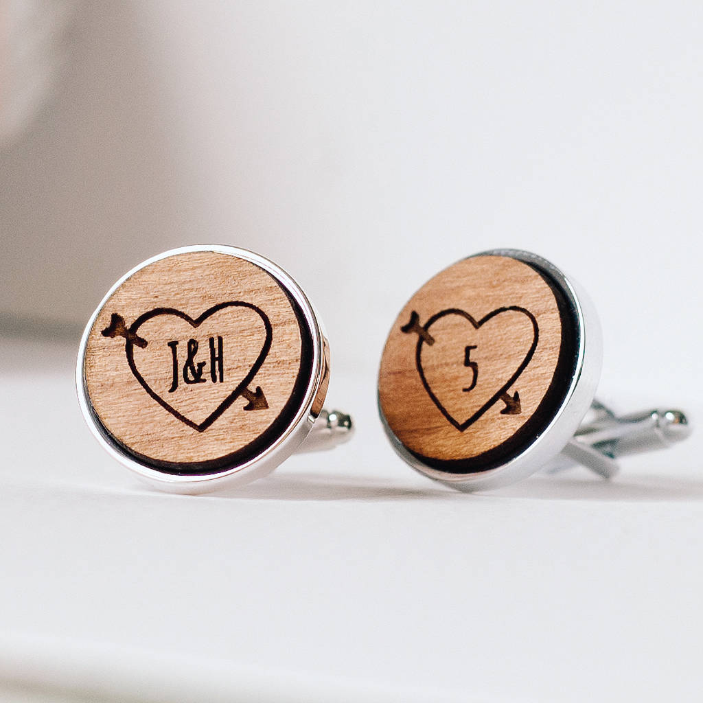 These cufflinks make the perfect fifth anniversary wooden gift for a husband, complete with your initials engraved into a love heart on one and the number five within a heart on the second.