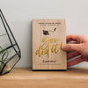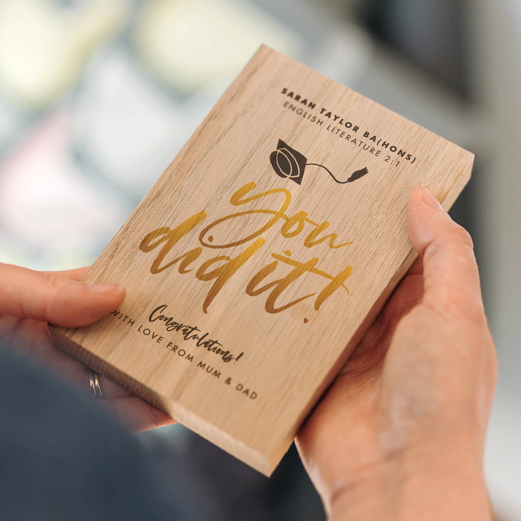 Featuring a bold graphic design of the traditional graduation mortarboard hat alongside the words "you did it!", you personalise your wood block with the name of the celebrating student, their course and result.