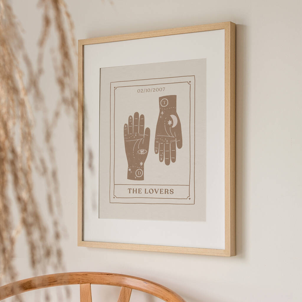 This unique print depicts two hand illustrations side by side on a tarot card, with the initials of the couple on each wrist and a special date at the top.