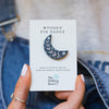 A handmade wooden pin badge for someone who loves the moon. This cute little moon pin is made to order by The Drifting Bear Co by the sea in Devon.