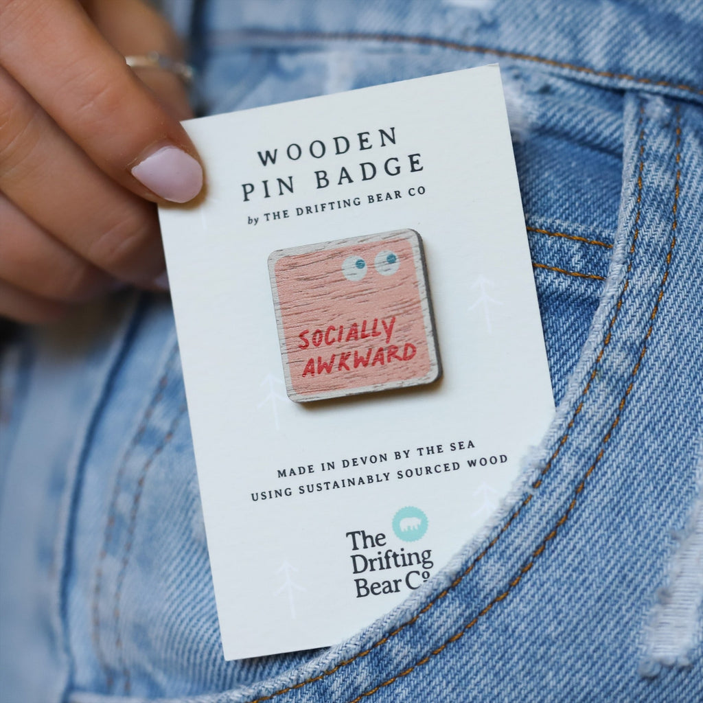 A handmade wooden pin badge for a socially awkward human. This cute pin is made to order by The Drifting Bear Co by the sea in Devon.