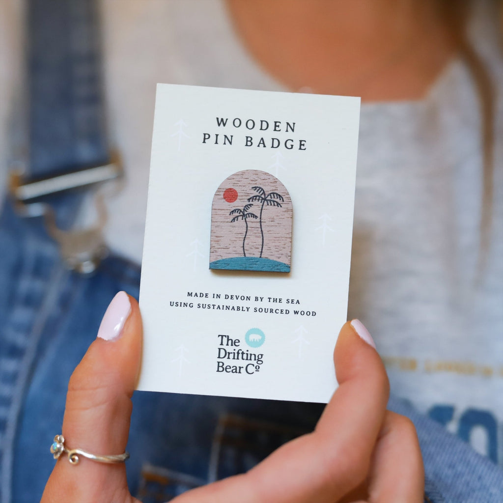 A handmade wooden pin badge for someone who loves the warm sun and palm trees. This cute little Tropical Island pin is made to order by The Drifting Bear Co by the sea in Devon.