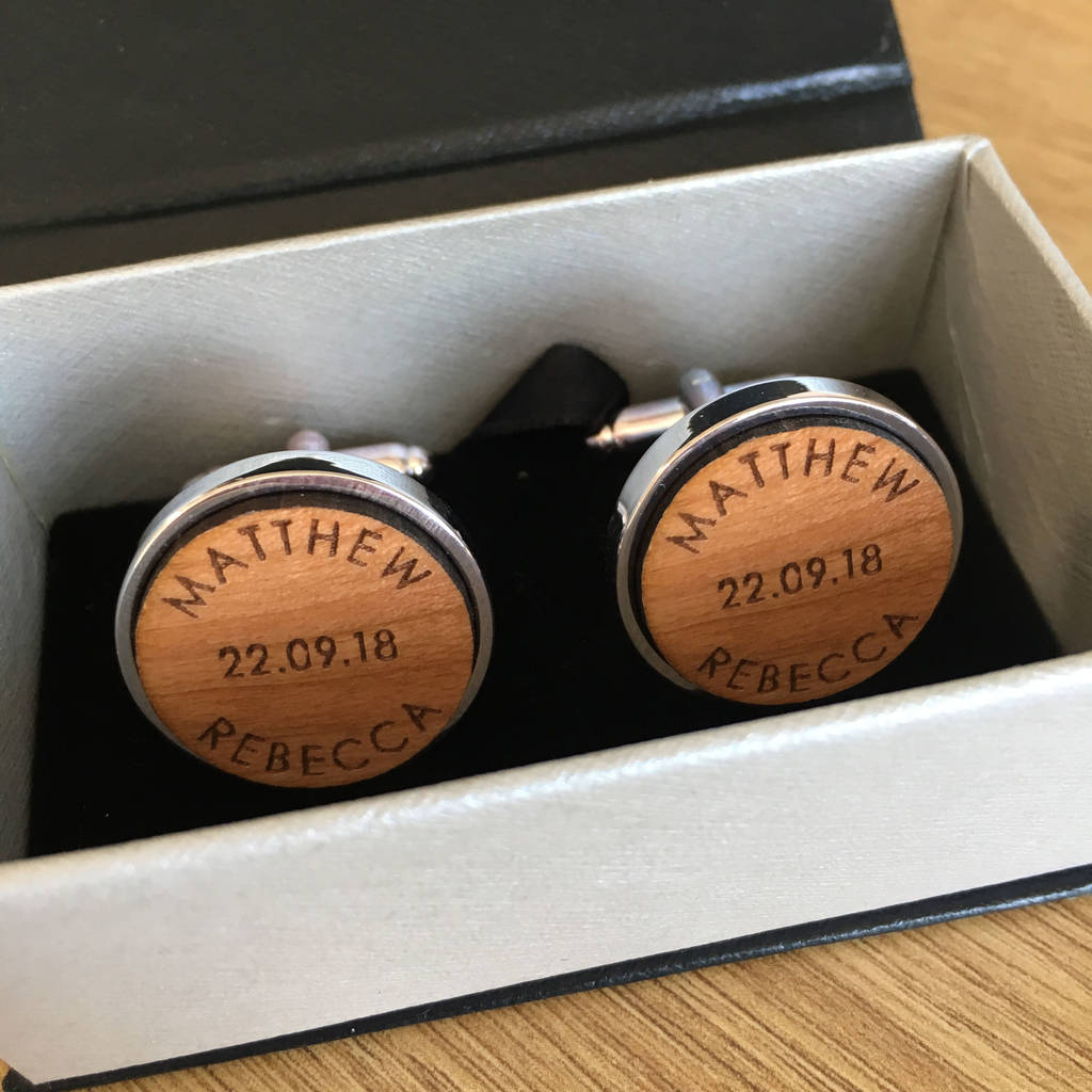 A pair of personalised wooden cufflinks, engraved with your own words.