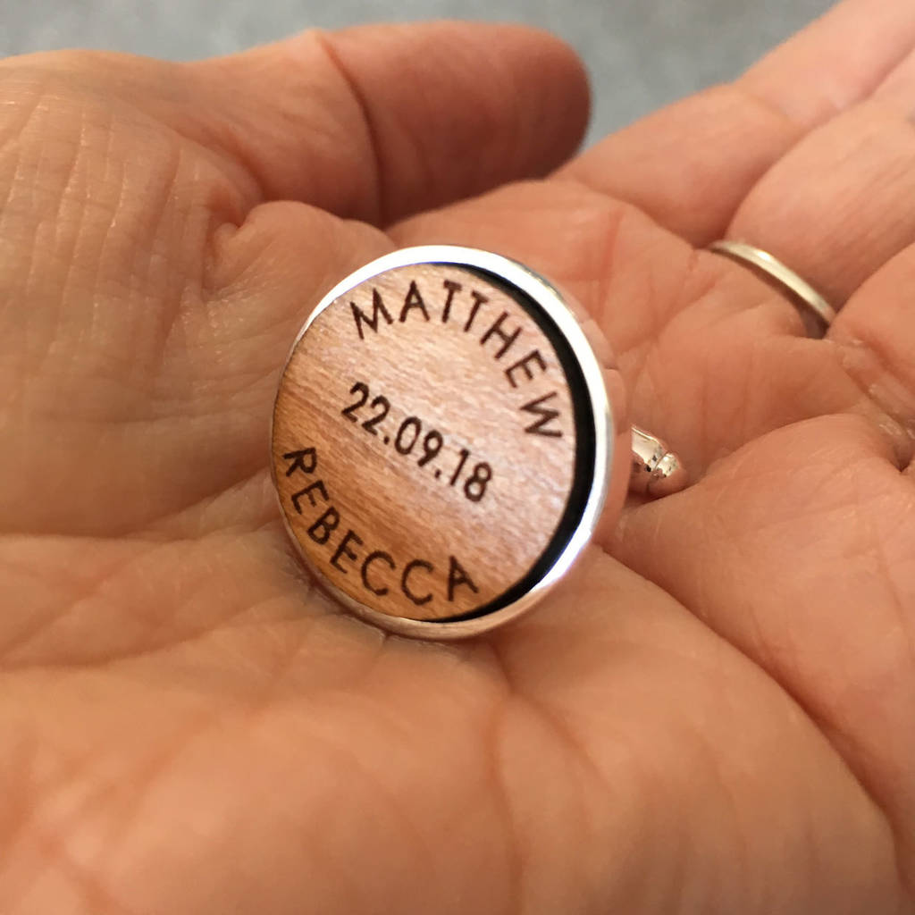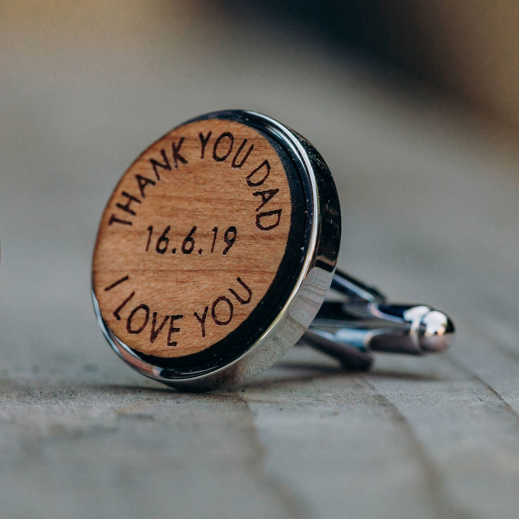 Silver-plated with engraved cherry wood, these personalised wooden cufflinks with your own message make a smart and thoughtful gift for the man in your life.