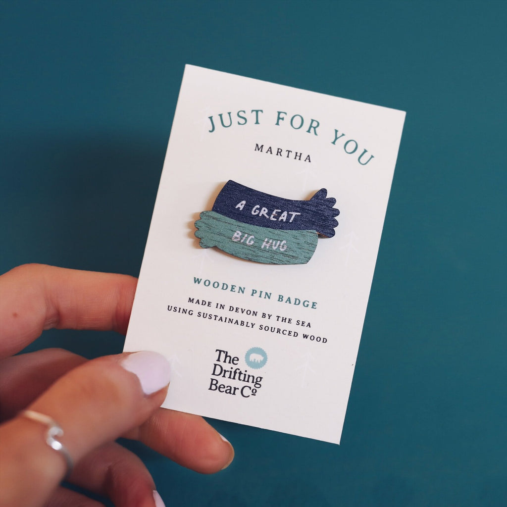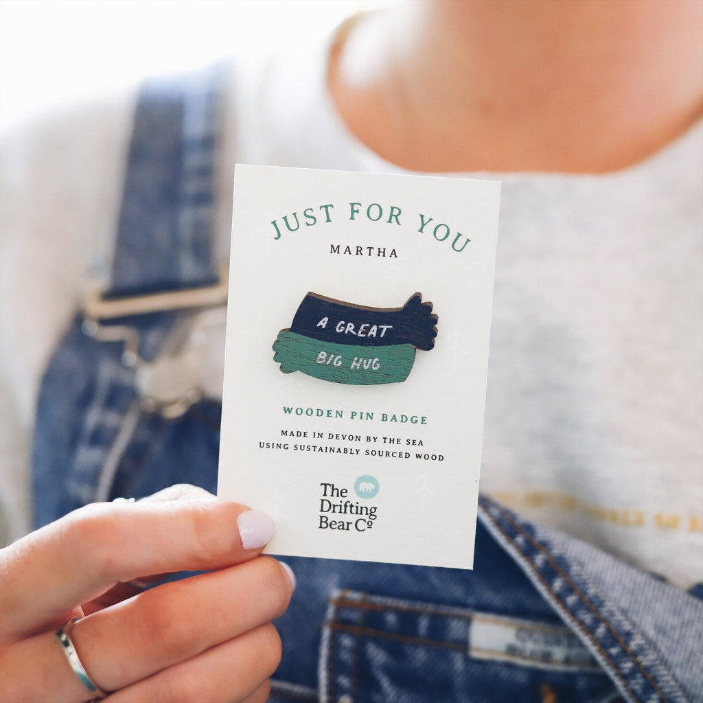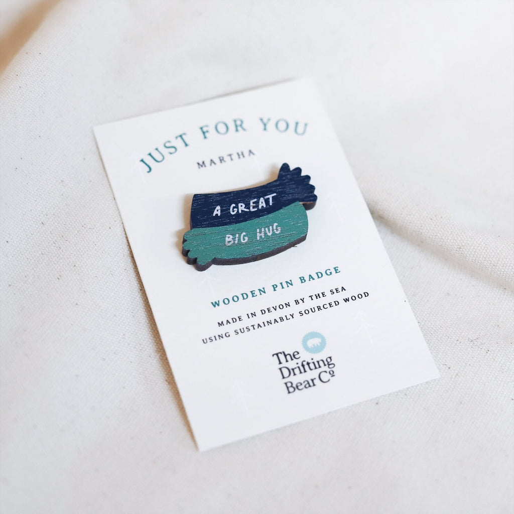 A handmade wooden pin badge for a hugger. Personalise the backing card with a name of your choice to make an extra special gift for somebody who may be in need of a great big hug. This cute pin is made to order by The Drifting Bear Co by the sea in Devon.