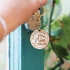 Each circular wooden design is approximately 4cm x 4cm, attached to a 5.3cm gold keychain