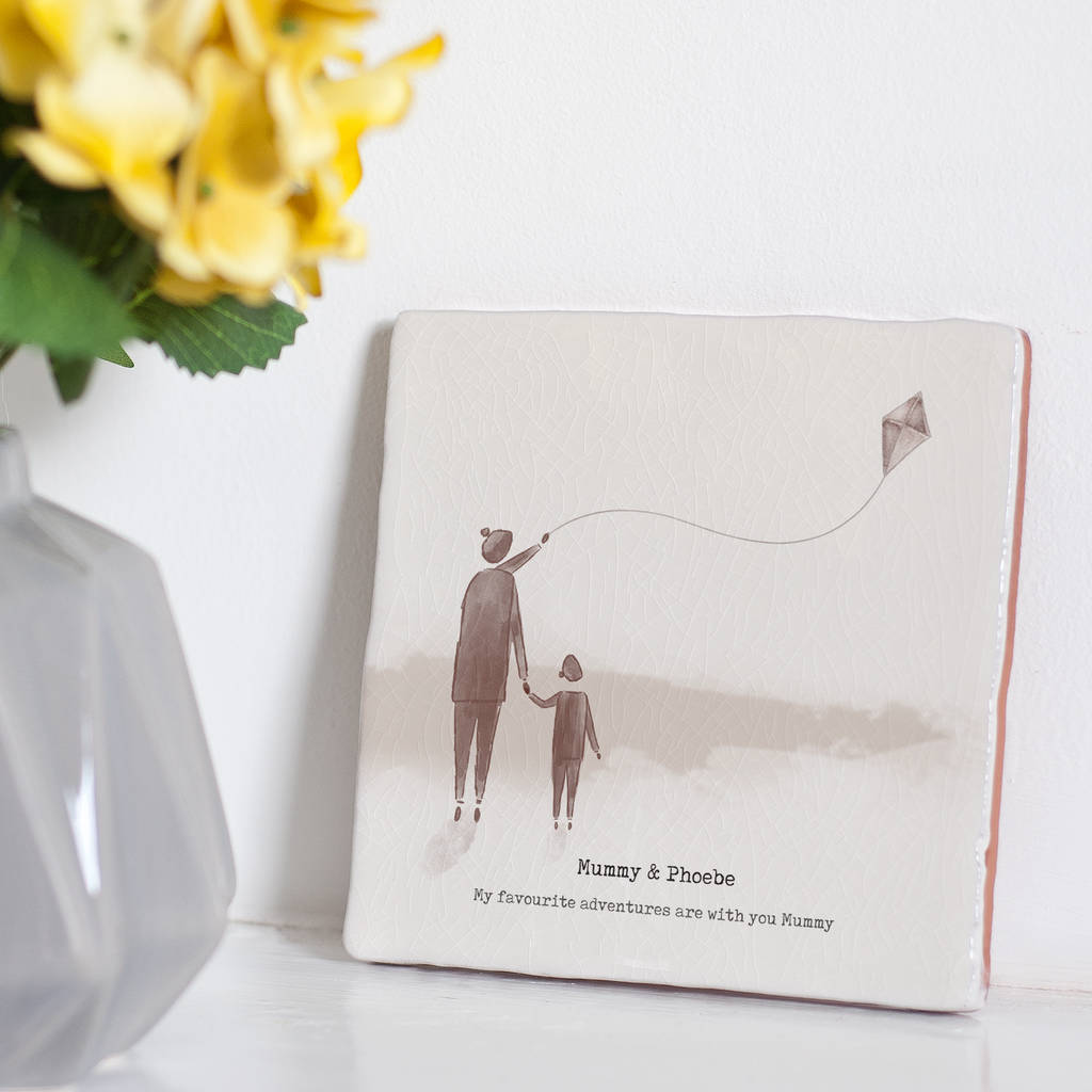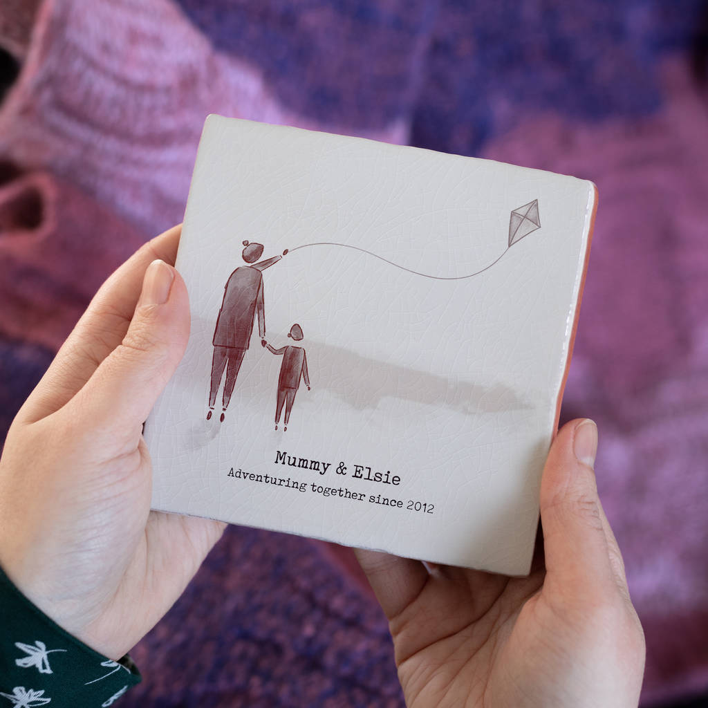 A personalised Mother and Child ceramic tile featuring an original illustration of a parent and child happily flying a kite and your own words.
