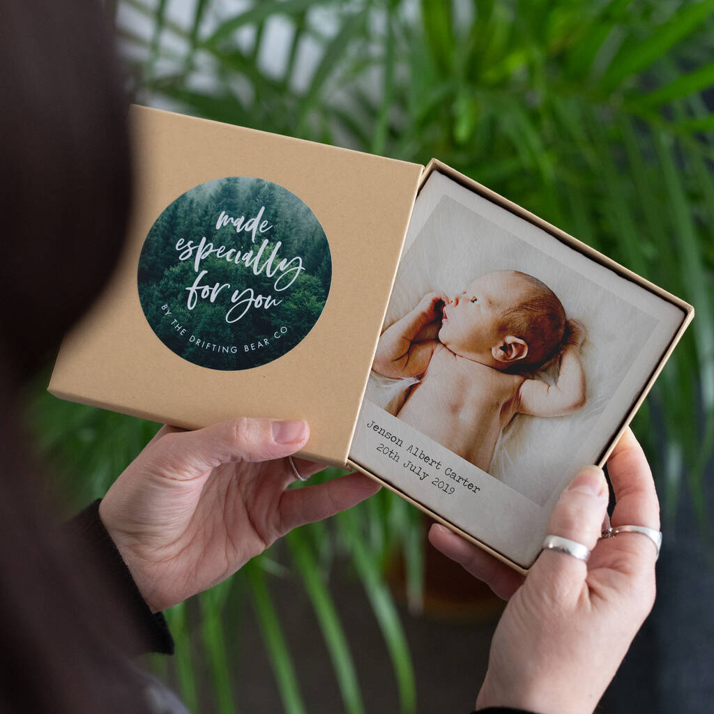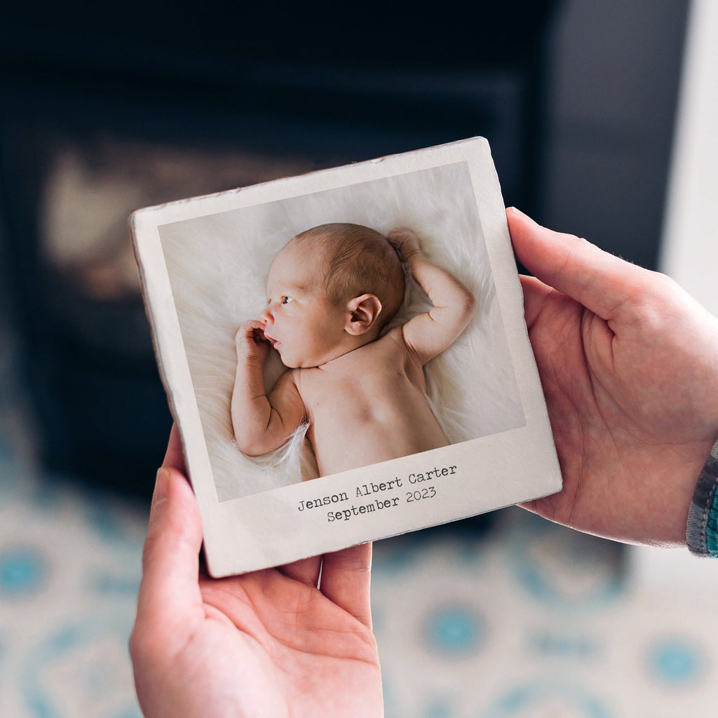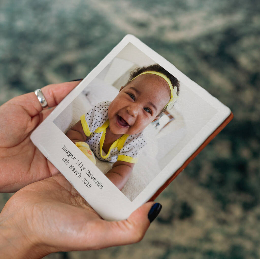 'Personalised New Baby Glazed Ceramic Retro Style Photo Tile' to commemorate the birth of a new baby.