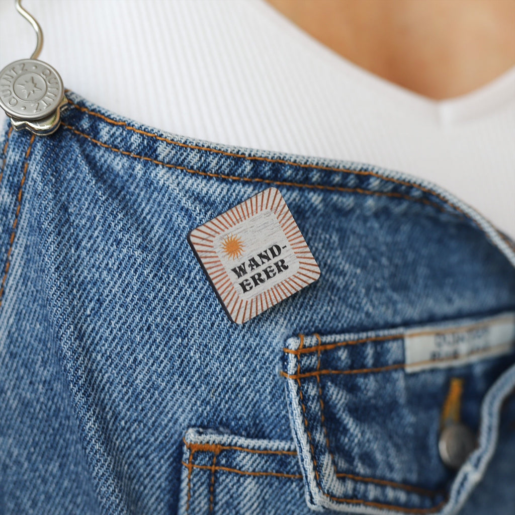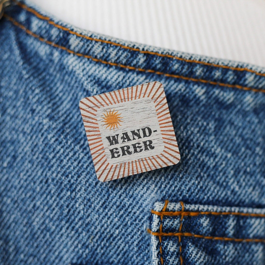 A lovely handmade wooden pin badge featuring the words 'Wanderer' underneath a shining sun. This cute pin is made to order by The Drifting Bear Co. by the sea in Devon.