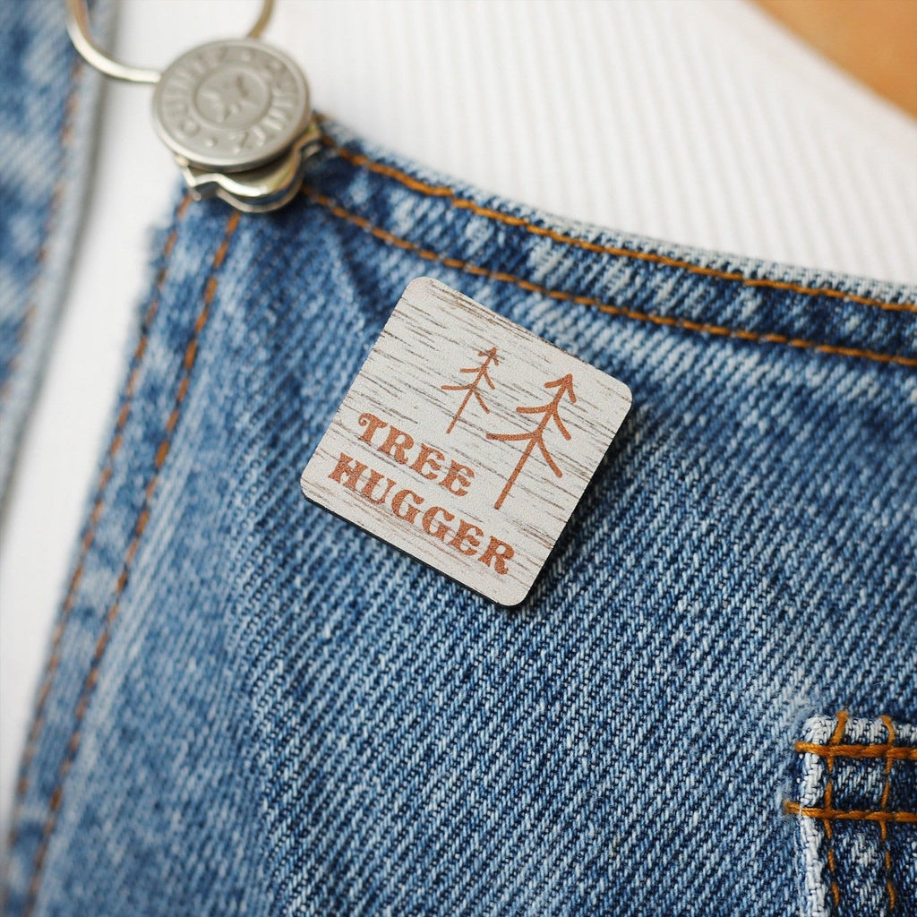 A lovely handmade wooden pin badge featuring the words 'Tree Hugger' with two illustrated trees above. This cute pin is made to order by The Drifting Bear Co. by the sea in Devon.