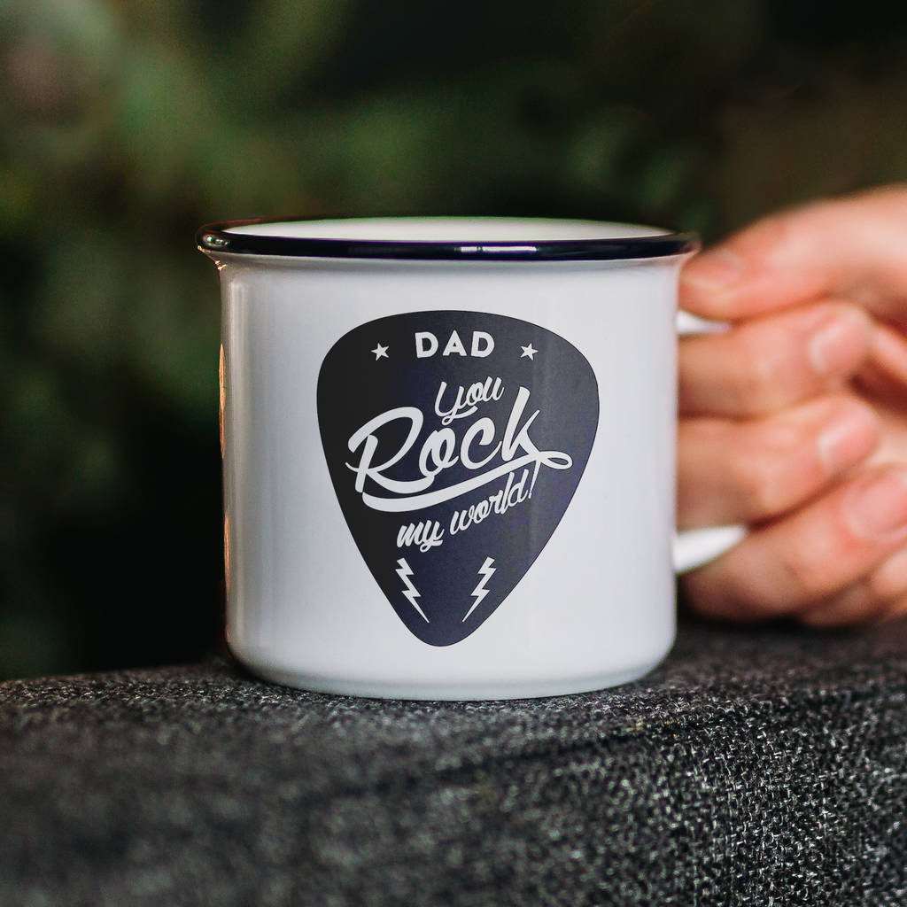 'You rock my world' ceramic camping style mug, perfect for the music fan in your life!